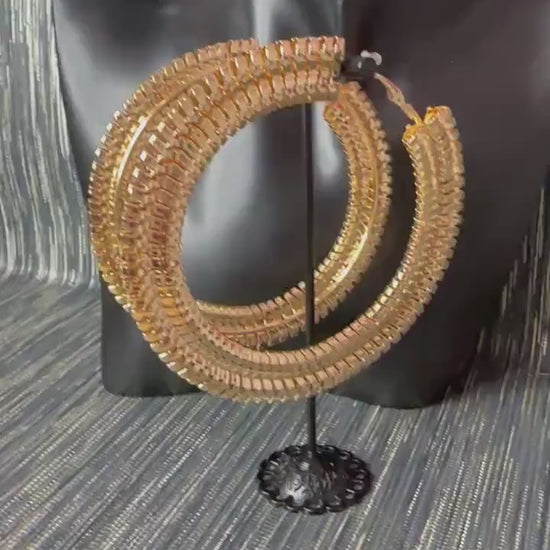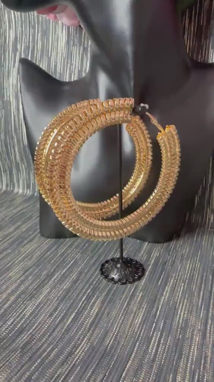 Large Patterned gold hoop earrings.